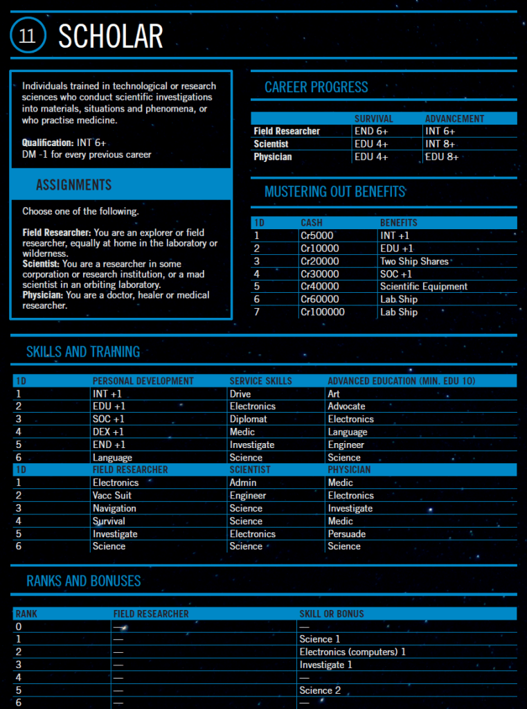 For those of you who have no idea what I’m talking about, allow me fill you in. The science fiction game Traveller was released in 1977 (just before Star Wars in fact!) and it’s hard sci-fi theme gave it an immediate and dedicated audience. Easily the most famous thing about Traveller, aside from its foreboding box art, is its character creation. No point buy to be seen here, and no “Roll 3d6 down the line”, instead after generating your stat points, you procede to guide your character through their entire life in four year chunks up until the point where they end up as an adventuring spacefarer.