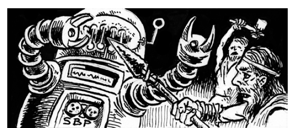 I believe that the intention of the adventure is that you play as a party of stone-age primitives, discovering this strange technological world as you bash robots with rocks. And the modules many pieces of art and the “primitive occupations” table for stone age zero-level characters at the end of the module are what lead me to this conclusion. Although I don’t think it would make much of a difference. The party I ran this module with were all adventures for medieval England, although I admit that “Caveman beats up a robot” has a slightly more compelling edge to me than “Farmer John beats up a robot”.
