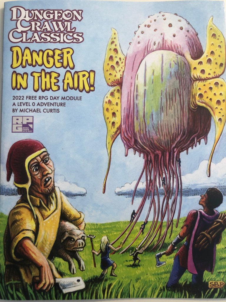 Danger in the Air has a bit more heavy lifting to do than its counterpart. Since it is an introduction not just to old-school style adventure but potentially a curious player’s (and GM’s) first adventure in a weird game called Dungeon Crawl Classics that requires you to roll a die you’ve never seen called a d16 and forces you to throw away your multi-page character backstory and roll up four level-0 peasants who are about to arrive at the ends of their short lives